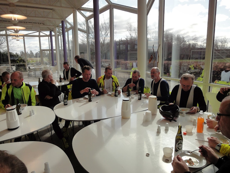 Dagens tur sluttede med fælles spisning, hvor klubben var vært ved øl, vand, kaffe og kage. Super Brugsen leverede som nævnt suppen. Under fællesspisning berettede formanden om sæsonens kommende aktiviteter, her er årets helt store oplevelse naturligvis Giro starten i Herning.
